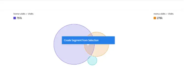 La variable Visualisation de diagramme de Venn peut vous aider à créer une comparaison rapide, ce qui vous permet de survoler les sessions, commandes, utilisateurs, etc.qui se chevauchent entre 2 et 3 segments personnalisés. Vous pouvez également créer rapidement des segments en cliquant avec le bouton droit de la souris sur l’une des sections qui se chevauchent :