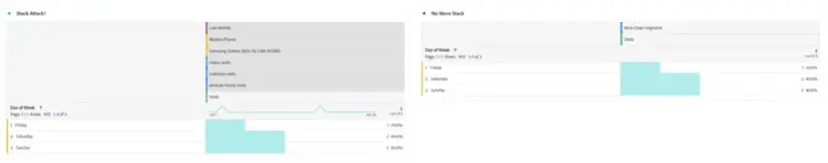 De même, vous pouvez créer les données d’intersection d’un diagramme de Venn en empilant simplement n’importe quel segment. Le nombre de segments ou dimensions individuelles que vous pouvez empiler ne comporte pas de limite. Par exemple, si je voulais savoir rapidement quels jours de la semaine le mois dernier mon site a connu une visite sur un téléphone portable, en particulier un Samsung Galaxy A52, qui a vu mes pages de menu et de nutrition, mais QUI N’a PAS vu ma page d’accueil, je peux la construire rapidement à la volée comme ceci :