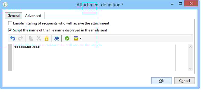Selezionare la scheda Advanced e selezionare Script the name of the file name displayed in the mails sent. Vai alla zona di modifica e immetti il nome che desideri assegnare all’allegato nella consegna finale.