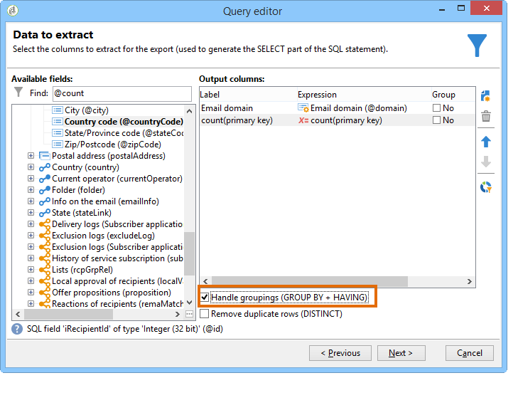 Selezionare la casella Handle groupings (GROUP BY + HAVING).