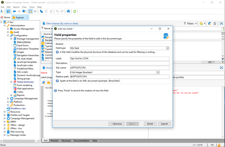 Per Field type, seleziona SQL field. Per l’etichetta, utilizza Opt-Out for CCPA. Seleziona il tipo 8-bit integer (boolean) e definisci il seguente Relative path univoco: @OPTOUTCCPA. Fai clic su Finish.