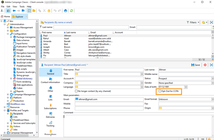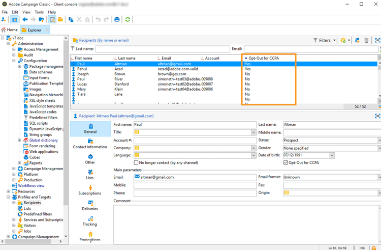 Per modificare lo stato di rinuncia, passa a Profiles and Target > Recipients e seleziona un destinatario. Nella scheda General viene visualizzato il campo configurato nella sezione precedente.