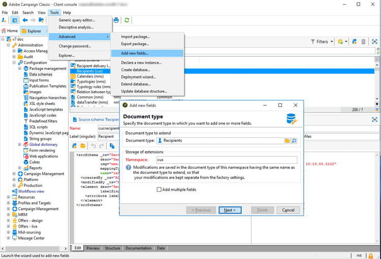 Passa a Tools > Advanced > Add new fields, seleziona Recipients come Document type e fai clic su Next. Per ulteriori informazioni sull’aggiunta di campi a una tabella, consulta questa sezione.