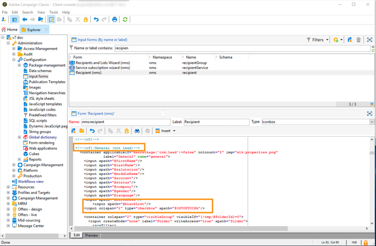 Fai clic sul nodo Configuration > Input forms dell’Explorer. In Recipient (nms), in “General Package” (Pacchetto generale), aggiungi un elemento