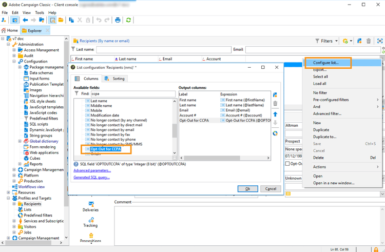 Fai clic sulla colonna per ordinare i destinatari in base alle informazioni di rinuncia. Puoi anche creare un filtro per visualizzare solo i destinatari che hanno rinunciato. Per ulteriori informazioni sui filtri, consulta la documentazione di Campaign v8 (console).