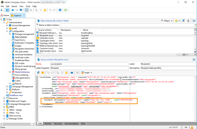 Questo estenderà o creerà lo schema Recipient (cus). Fai clic su di esso per verificare che il campo sia stato aggiunto correttamente.