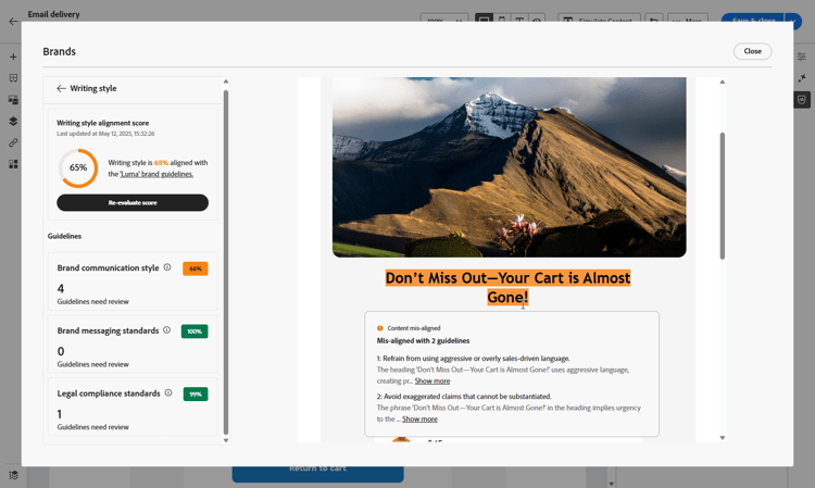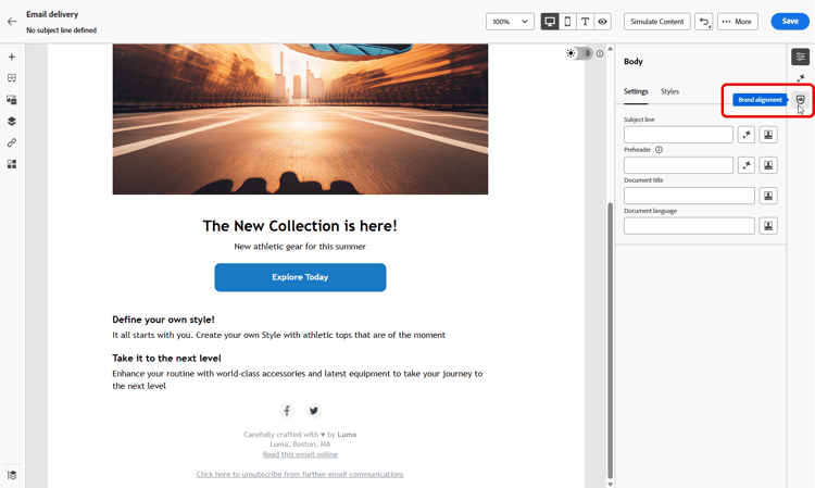 Una volta configurato e pubblicato il brand, valuta il tuo punteggio di allineamento del brand direttamente all'interno della tua campagna e-mail per garantire che il contenuto sia allineato alle linee guida del brand: