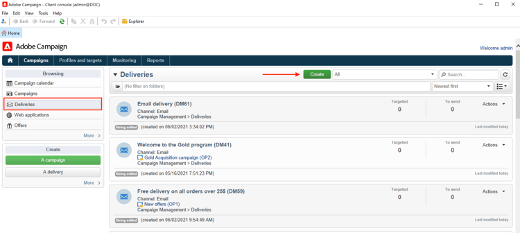 Per creare una nuova consegna, passa alla scheda Campagne, fai clic su Consegne e fai clic sul pulsante Crea sopra l'elenco delle consegne esistenti.