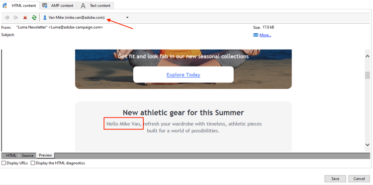 Nell’esempio seguente, scoprirai i passaggi per progettare una consegna e-mail in Adobe Campaign che contiene dati personalizzati, collegamenti a un URL esterno e un collegamento alla pagina speculare.