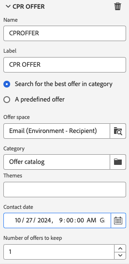 Cerca l'offerta migliore nella categoria: seleziona questa opzione e specifica i parametri di chiamata del motore di offerta (spazio dell'offerta, categoria o temi, data di contatto, numero di offerte da mantenere). Il motore calcolerà le offerte migliori da aggiungere in base a questi parametri. È consigliabile completare il campo Categoria o Tema, anziché entrambi contemporaneamente.