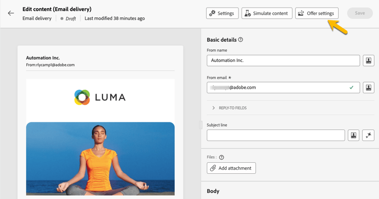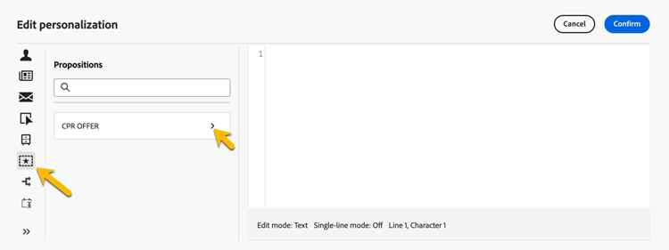 Nella finestra di progettazione e-mail, quando si aggiunge una personalizzazione con offerte, fare clic sull'icona Proposte per visualizzare le offerte ottenute dall'attività Arricchimento. Apri l’offerta da scegliere facendo clic su di essa.
