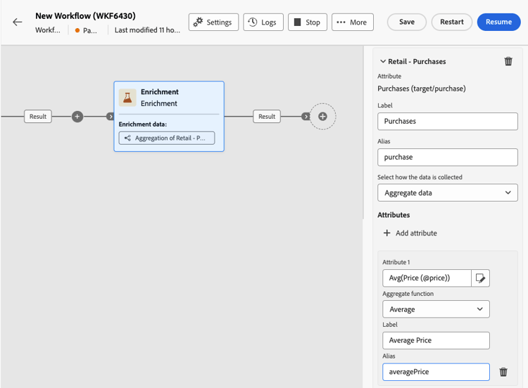 È stata aggiunta una seconda attività Enrichment per arricchire i dati della tabella del flusso di lavoro con i dati di acquisto provenienti dall'attività Load file. Questo ci consente di utilizzare tali dati in ulteriori attività, ad esempio per personalizzare i messaggi inviati ai clienti con le informazioni sul loro acquisto.