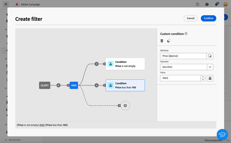 Ora puoi definire il valore massimo per l’attributo di arricchimento. Gli elementi superiori a 100$ vengono filtrati. Scopri come utilizzare Query Modeler
