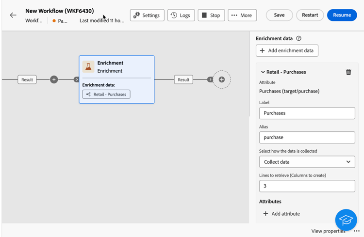 Fare clic su Aggiungi dati di arricchimento e selezionare l'attributo da utilizzare per l'arricchimento. Scopri come selezionare gli attributi e aggiungerli ai preferiti.
