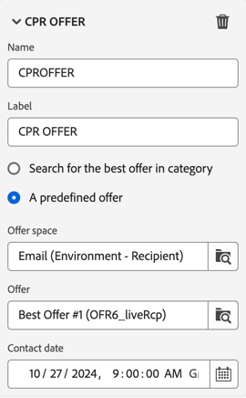 Offerta predefinita: seleziona questa opzione e specifica uno spazio dell'offerta, un'offerta specifica e una data di contatto per configurare direttamente l'offerta da aggiungere senza chiamare il motore delle offerte.