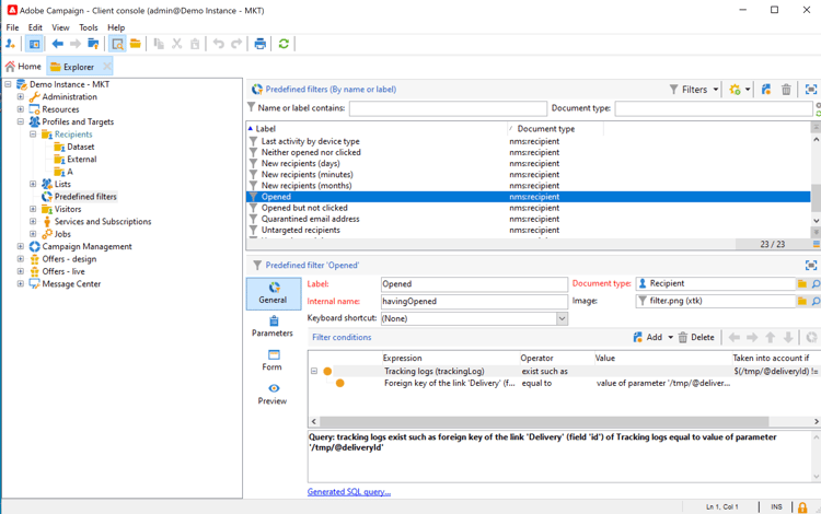 È possibile accedere ai dettagli dei filtri nel nodo Profiles and Targets > Pre-defined filters di Explorer.