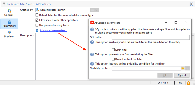 Fare clic sulla scheda Parameters e selezionare Default filter for the associated document type.