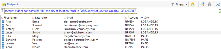 Definisci le condizioni di filtro. Nell’esempio seguente, filtrerai in base ai destinatari il cui numero di account non inizia con NL e che vivono a Parigi o Los Angeles.