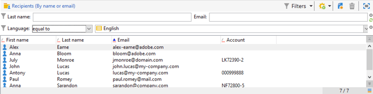 I campi sopra ogni elenco ti consentono di utilizzare il filtro predefinito per questo elenco. Per impostazione predefinita, per l’elenco dei destinatari puoi filtrare in base al nome e all’indirizzo e-mail.
