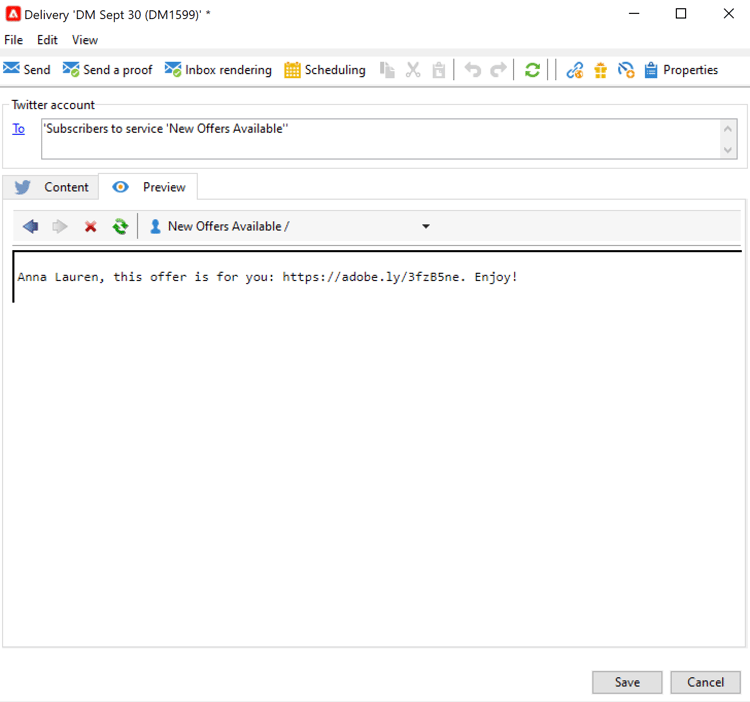 Prima di inviare il messaggio, assicurati di convalidarlo inviando una bozza a un account di prova: potrai quindi ottenere un rendering esatto del messaggio su un account X privato e controllare il contenuto e la personalizzazione.