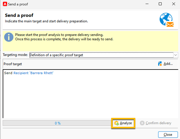 Nell'esempio seguente, scegliamo Definition of a specific proof target e aggiungiamo un destinatario: