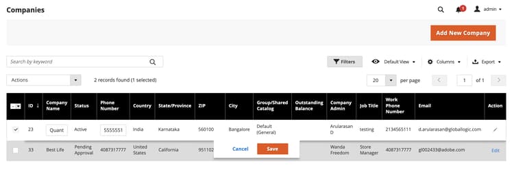 Trovare la società nella griglia e fare clic su Edit nella colonna Action.