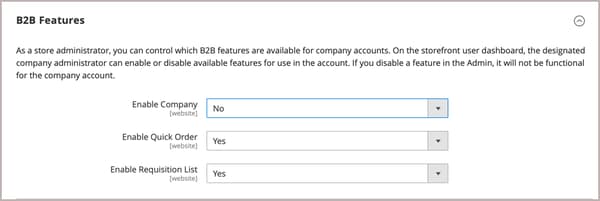 Per impostazione predefinita, tutte le funzioni B2B sono inizialmente disabilitate. L’amministratore dello store può abilitare o disabilitare le funzioni B2B in base alle esigenze degli store di Commerce. Per un elenco completo delle impostazioni di configurazione B2B, vedi Riferimento configurazione funzionalità B2B.