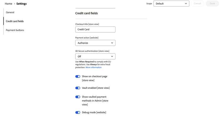 Abilita o disabilita l'opzione di pagamento con carta di credito e debito in cui sono visualizzati i pulsanti di pagamento. Opzioni: Yes / No