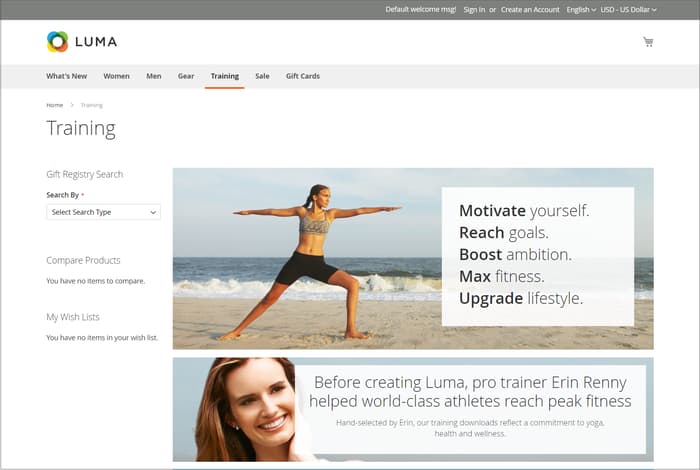Con un layout 2 Columns with Right Bar, l'area del contenuto principale è sufficientemente grande da consentire la visualizzazione di immagini o banner accattivanti. Questo layout viene spesso utilizzato anche per le pagine di prodotto con blocchi di contenuto di supporto a destra.