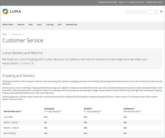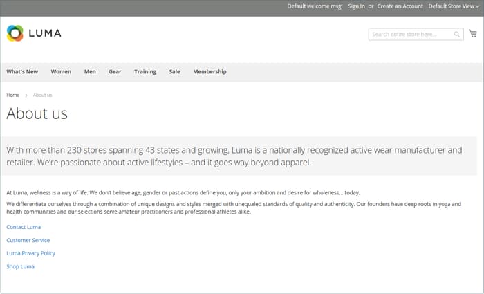 Nell'archivio demo Commerce sono presenti esempi di pagine di contenuto di base utili per iniziare. Puoi modificare tutte queste pagine in base alle tue esigenze. Guarda le pagine seguenti del tuo negozio e assicurati che il contenuto trasmetta il messaggio, la voce e il marchio.