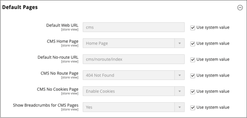 table 0-row-3 1-row-3 2-row-3 3-row-3 4-row-3 5-row-3 6-row-3 layout-auto Campo Ambito Descrizione Default Web URL Visualizzazione store Indica la pagina di destinazione associata all’URL di base. Per impostazione predefinita, questo campo è impostato su cmsper indicare una pagina del sistema di gestione dei contenuti Commerce. Puoi anche utilizzare un tipo diverso di pagina di destinazione, ad esempio un blog. Se ad esempio nel server dimagento/blogè installato un blog, è possibile immettere il nome della cartellablogcome percorso relativo per la selezione delle pagine.CMS Home Page Visualizzazione store Per scegliere la home page del negozio, è sufficiente selezionare la pagina CMS dall'elenco. Per impostazione predefinita, la home page di CMS elenca l'intera selezione di pagine CMS disponibili per lo store. Default No-route URL Visualizzazione store Contiene l'URL della pagina predefinita da visualizzare quando si verifica un errore 404 Page not Found. Il valore predefinito ècms/noroute/index.CMS No Route Page Visualizzazione store Identifica una pagina CMS specifica che si desidera visualizzare quando si verifica un errore Pagina 404 non trovata. La pagina predefinita è 404 Not Found.CMS No Cookies Page Visualizzazione store Identifica una pagina CMS specifica che viene visualizzata quando i cookie non sono abilitati per il browser. La pagina spiega perché vengono utilizzati i cookie e come abilitarli per ogni browser. La pagina predefinita è Enable Cookies.Show Breadcrumbs for CMS Pages Visualizzazione store Determina se un percorso di breadcrumb viene visualizzato in tutte le pagine CMS del catalogo. Opzioni: Yes/No -