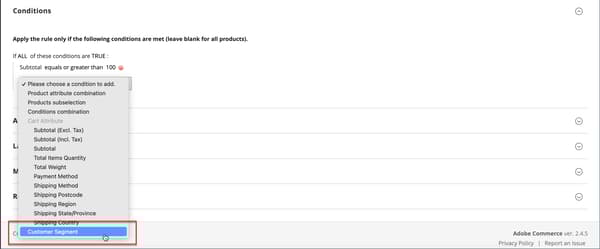 ), che visualizza l'elenco delle condizioni. Quindi, scegliere Customer Segment.