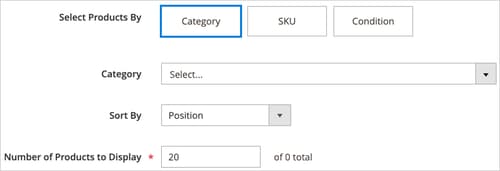 Puoi selezionare i prodotti per categoria, SKU o condizione. Queste opzioni si escludono a vicenda. Ad esempio, non è possibile selezionare l’opzione Categoria, utilizzare il selettore Categoria, quindi passare all’opzione Condizione per aggiungere alcune condizioni. I prodotti vengono selezionati solo in base a quanto impostato per una di queste tre opzioni.