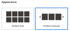 table 0-row-2 1-row-2 2-row-2 layout-auto Tipo Descrizione Griglia prodotti Visualizza i prodotti all'interno di una griglia che mostra cinque prodotti per riga (per impostazione predefinita), con tutte le righe necessarie per visualizzare il numero immesso nell'impostazione Number of Products to Display. Carosello prodotto Visualizza i prodotti all’interno di un carosello (noto anche come dispositivo di scorrimento). Il carosello mostra fino a cinque prodotti per diapositiva.