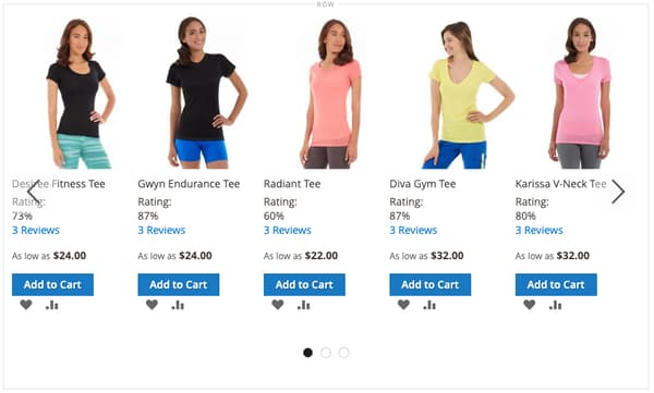 Aggiungi i caroselli di prodotti direttamente ai contenitori con larghezza di pagina, come righe, schede o layout a una colonna. L’utilizzo di layout a larghezza di pagina garantisce una visualizzazione reattiva dei prodotti. Page Builder riduce il numero di prodotti visualizzati in base alla larghezza della pagina, non alla larghezza del contenitore.