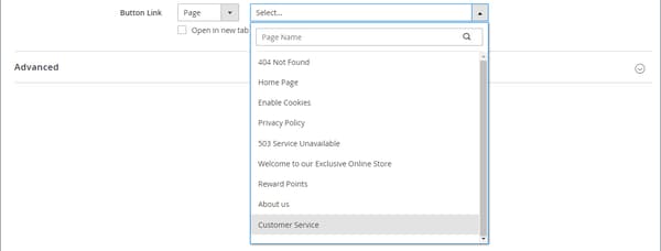 Page - Immettere il nome di una pagina CMS (parziale o completa) oppure fare clic nel campo vuoto per visualizzare l'elenco completo. Scegliere quindi il nome della pagina nell'elenco dei risultati della ricerca.
