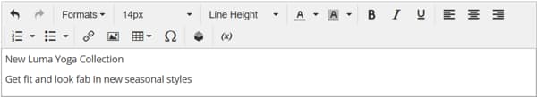 Utilizza il tipo di contenuto Testo per aggiungere un contenitore di testo con un editor WYSIWYG ("What You See Is What You Get") in Page Builder stage. È inoltre possibile aggiungere collegamenti, immagini, variabili e widget al testo dalla barra degli strumenti dell'editor.