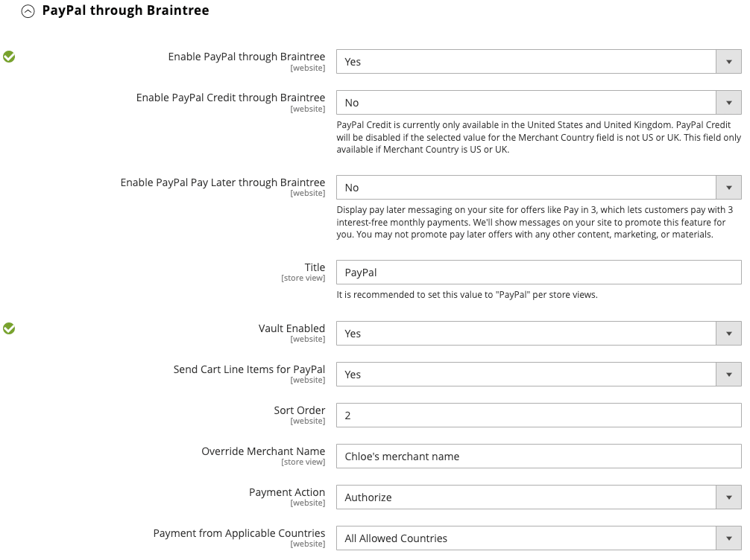 Per includere PayPal come opzione di pagamento con Braintree, impostare Enable PayPal through Braintree su
