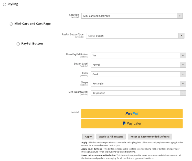 Per ripristinare i valori predefiniti consigliati per i pulsanti e i messaggi PayLater e applicarli a tutti i tipi di pulsanti e le posizioni, fare clic su Reset to Recommended Defaults.
