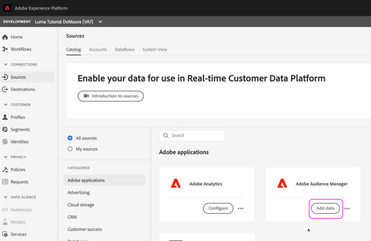 Passa alla scheda Origini in AEP e apri le impostazioni per il connettore di origine di Audience Manager: