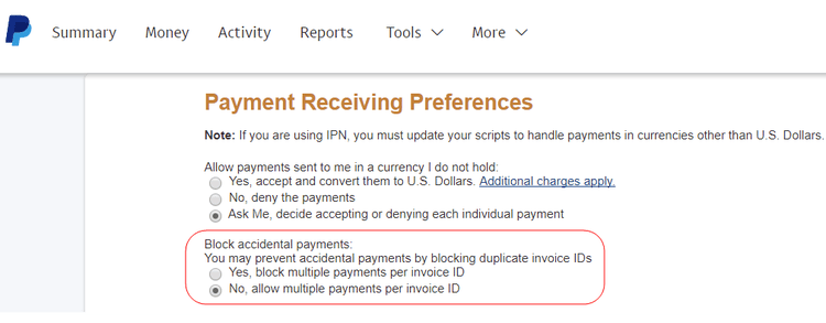 Si verifica un errore quando gli ID fattura duplicati vengono inviati a PayPal. In questo articolo viene illustrato come risolvere il problema aggiornando le preferenze di ricezione del pagamento PayPal per consentire più pagamenti per ID fattura.