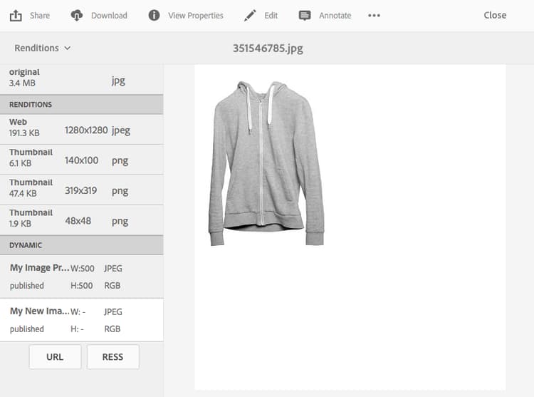 note note NOTE Per poter rendere disponibili i pulsanti URL o RESS, la risorsa selezionata e il predefinito immagine o il predefinito visualizzatore devono essere pubblicati. Dynamic Media: la modalità ibrida richiede la pubblicazione di predefiniti immagine; Dynamic Media: la modalità Scene7 pubblica automaticamente i predefiniti immagine. -