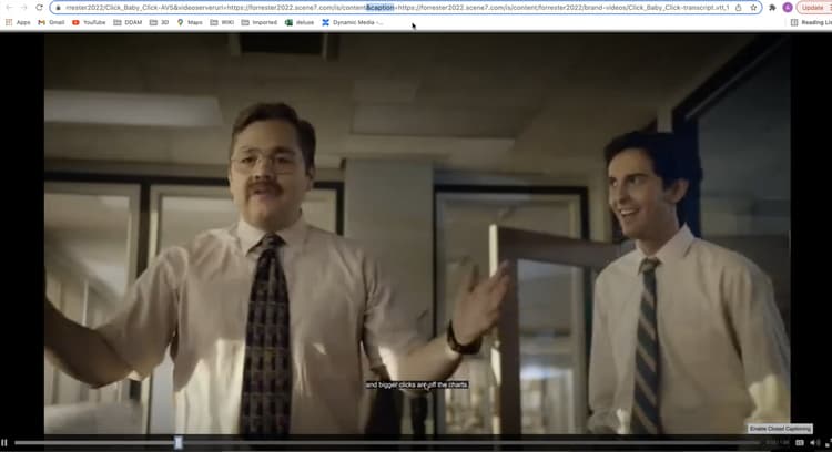 Nell’illustrazione seguente, la parte “caption” nell’URL fa riferimento alla trascrizione (file .vtt). Nel video, il testo parlato (testo trascritto) compare come sottotitolo codificato in corrispondenza del tempo appropriato nel video. L’utente può abilitare o disabilitare i sottotitoli mediante il pulsante CC.