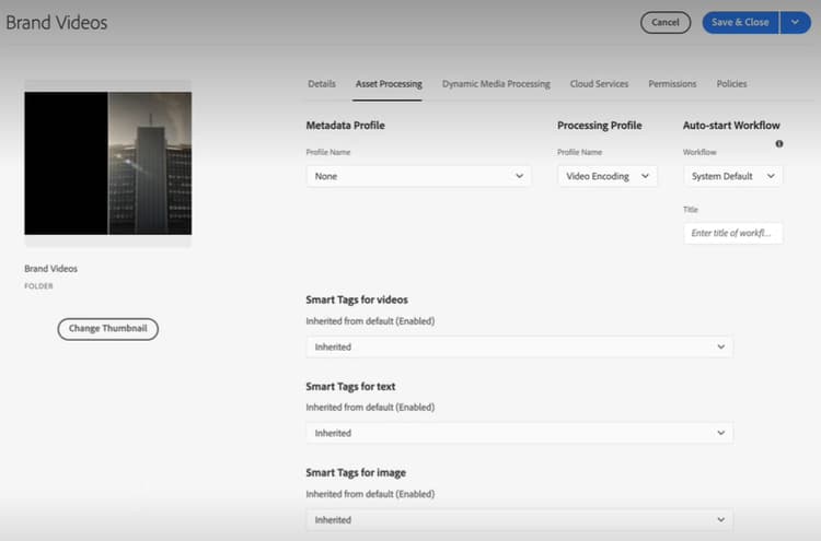Seleziona una cartella nell’interfaccia utente di Assets e fai clic su Proprietà per aprire le proprietà della cartella. Fai clic sulla scheda Elaborazione delle risorse e seleziona il profilo di elaborazione appropriato per la cartella dall’elenco Profilo di elaborazione. Per salvare le modifiche, fai clic su Salva e chiudi.