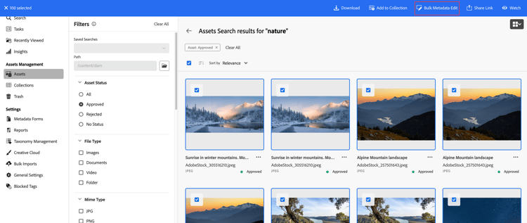 La funzionalità Bulk Metadata Edit di Assets View consente di modificare un set predefinito di campi di metadati standard per più file di risorse contemporaneamente. Seleziona più risorse e aggiorna contemporaneamente in blocco il set predefinito di metadati standard, anziché aggiornare singolarmente i metadati standard di ogni risorsa. Questa funzionalità consente di mantenere l'efficienza, la coerenza e l'accuratezza dell'insieme di proprietà di metadati standard nei grandi insiemi di risorse, migliorando la ricercabilità e l'organizzazione di tali risorse.