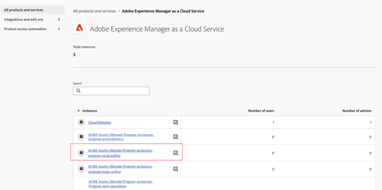 Fai clic sull’istanza di authoring di produzione per AEM as a Cloud Service: