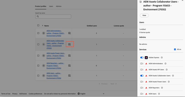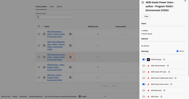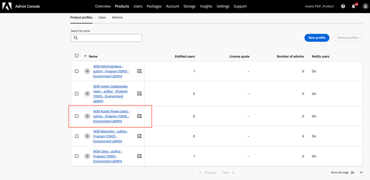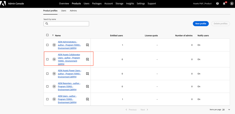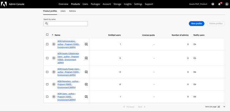 L’istanza di AEM as a Cloud Service su Admin Console ora include i seguenti profili di prodotto: