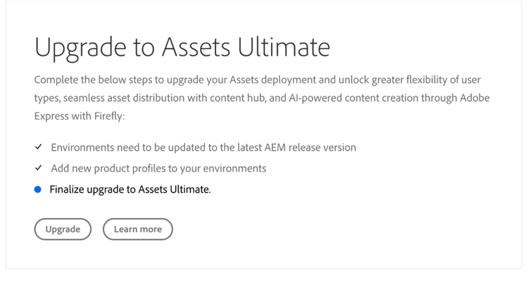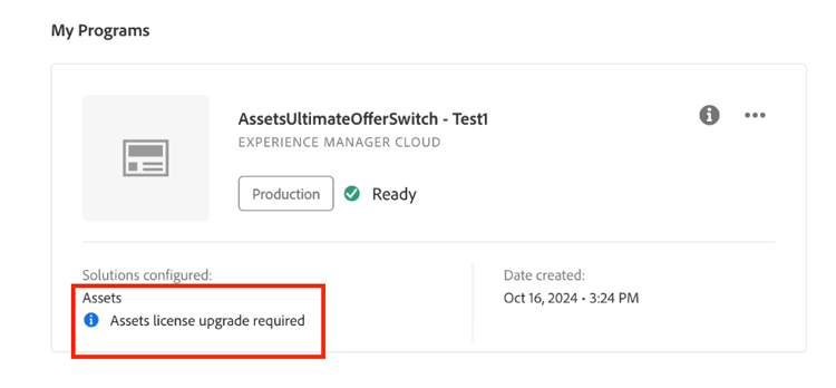 I clienti Assets as a Cloud Service esistenti possono effettuare l’aggiornamento ad Assets Ultimate eseguendo due semplici passaggi. Puoi passare al programma Assets as a Cloud Service in Cloud Manager e visualizzare lo stato dell’aggiornamento nella scheda Programma in base alla disponibilità dei crediti di Assets Ultimate. Se sono disponibili crediti sufficienti per l'aggiornamento ad Assets Ultimate, è possibile visualizzare lo stato come Assets license upgrade required, come illustrato nell'immagine seguente: