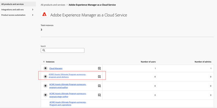 Se hai abilitato Content Hub per Assets as a Cloud Service, è stata creata una nuova istanza all'interno di AEM Assets as a Cloud Service su Admin Console con delivery come suffisso: