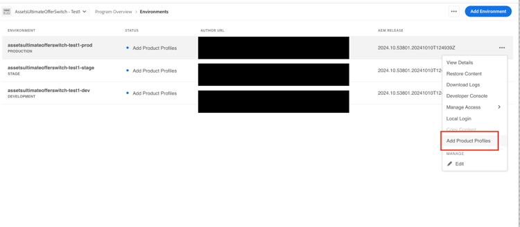 Puoi anche aggiungere profili di prodotto agli ambienti selezionati passando alla sezione Ambienti, facendo clic sull'icona Altre opzioni corrispondente a un ambiente e selezionando Aggiungi profili di prodotto.